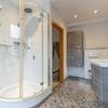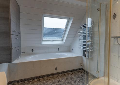 Badezimmer: Tageslichtbad mit Badewanne, Dusche, beheiztem Handtuchhalter und modernen Badezimmermöbeln