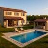 Auf einem Teil des Grundstücks (ca. 870 m²) befindet sich ein Baugrundstück mit Baugenehmigung für ein elegantes Wohnhaus im mediterranen Stil. Das Gebäude fügt sich mit seiner Optik und seinem Stil harmonisch in die bestehende Umgebung, die Nebengebäude und den Swimmingpool ein.