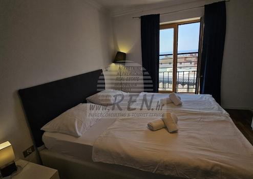 Die Wohnung besteht aus einem Eingangsbereich, zwei Schlafzimmern, einem Badezimmer sowie einem Wohnzimmer mit Küche. Obwohl keine Terrasse vorhanden ist, sorgen die einzigartige Lage und der offene Meerblick für echtes mediterranes Wohngefühl. Zur Wohnung gehören ein Parkplatz und ein Abstellraum.