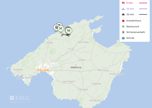 Rund um Lluc finden sich praktische Anlaufstellen: Die Apotheke Farmaciola liegt in der näheren Umgebung, ebenso eine Klinik. Für Familien ist die Escolania de Lluc als schulisches Angebot in der Umgebung ein Pluspunkt. Auch das Laden eines E Autos ist unkompliziert möglich, da mehrere E Ladestationen in der Umgebung zur Verfügung stehen.