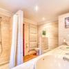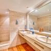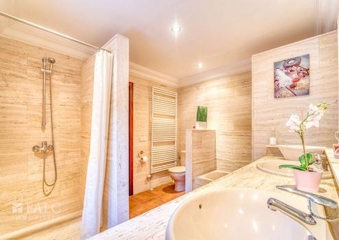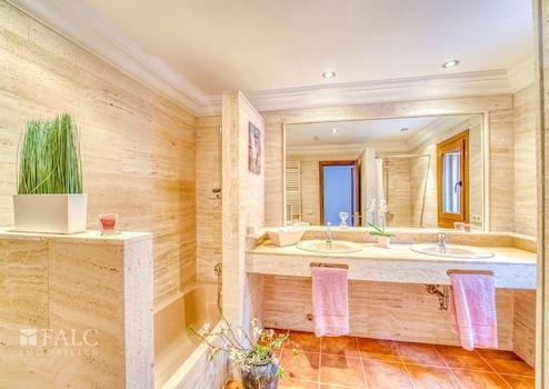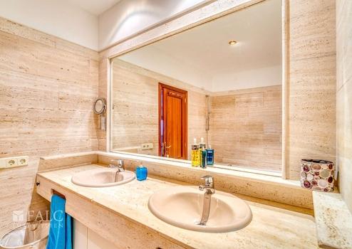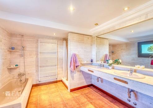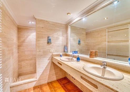 An beide Wohnbereiche schließen sich jeweils zwei großzügige Schlafzimmer mit eigenen Bädern an. Die insgesamt vier Badezimmer sind hochwertig ausgestattet, unter anderem mit edlem Marès-Stein sowie Dusche und Badewanne. Die Schlafzimmer selbst bieten mit etwa 20 bis 23 m² komfortable Rückzugsorte mit viel Raum und Privatsphäre.