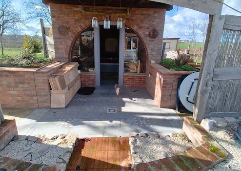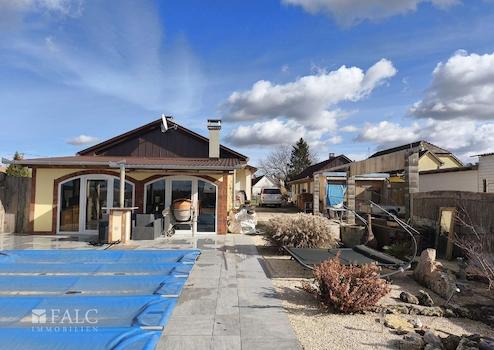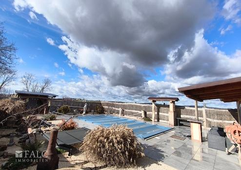 Im Außenbereich befindet sich ein Pool (8 x 4 m, 1,50 m tief), ein Relaxraum, Hochbeete, Wasserbehältergebäude sowie mehrere Nebengebäude. Der Garten bietet viel Privatsphäre und Raum zur individuellen Gestaltung.
