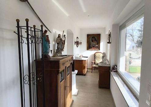Das Gästehaus verfügt über Küche, Essecke, Badezimmer mit Dusche sowie ein Schlafzimmer (alternativ als Arbeits- oder Esszimmer nutzbar). Ein Kellerbereich ist vorhanden, die Treppe wird noch fertiggestellt. Aktuell wird das Gästehaus bewohnt, das Haupthaus ist Erstbezug.