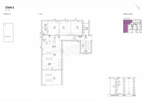 In Privlaka bei Zadar steht eine im Bau befindliche Wohnung zum Verkauf. Die 88,42 m² große Wohnung befindet sich im ersten Obergeschoss eines Wohngebäudes mit 10 Wohneinheiten. Sie besteht aus einem Wohnzimmer, einer Wohnküche, drei Schlafzimmern, zwei Badezimmern, einem Ankleidezimmer, einem Flur und einer 19,57 m² großen Loggia. Zur Wohnung gehört außerdem ein privater Stellplatz im Innenhof des Gebäudes. Die Gesamtnutzfläche der Wohnung inklusive Nebenräume beträgt 120,49 m² (K.V. 105,60 m²).