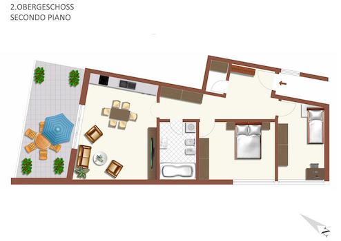 Geräumiger EingangsbereichHelle Wohnküche mit direktem Zugang zur großen Panoramaterrasse2 SchlafzimmerBadFlurAbstellraumKellerGaragenbox