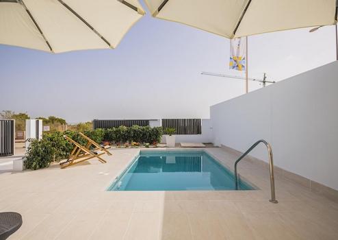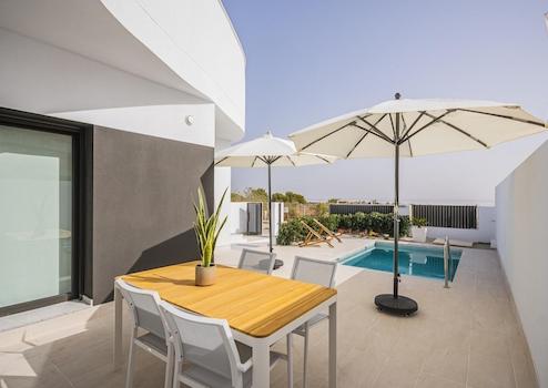Die Villen bieten von den Terrassen aus beeindruckende Ausblicke auf den rosa Salzsee, der der Umgebung eine unverwechselbare mediterrane Atmosphäre verleiht. Der private Pool lädt zu entspannten Stunden im Freien ein, während die stilvolle Ausstattung und die durchdachte Raumaufteilung höchsten Wohnkomfort gewährleisten.
