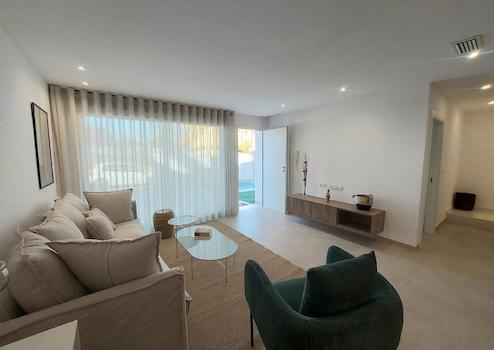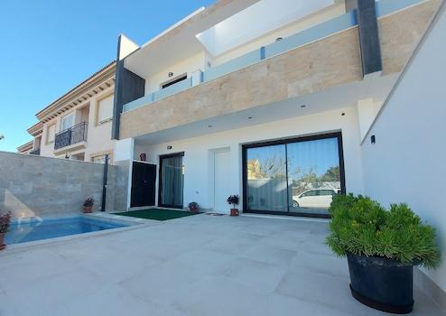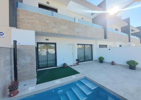 Diese exklusive Reihen-Villa mit drei Schlafzimmern und drei Badezimmern bietet höchsten Wohnkomfort und mediterranes Lebensgefühl. Auf Ihrem eigenen Grundstück genießen Sie einen privaten Swimmingpool sowie einen Stellplatz, während die großzügige Gestaltung der Villa Raum für Erholung und Freizeitaktivitäten schafft.