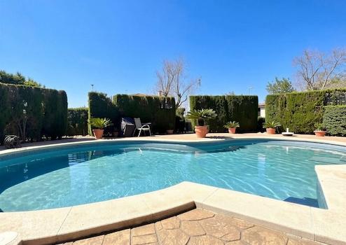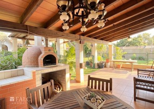 Der Außenbereich bietet einen großen Garten, eine überdachte Terrasse mit BBQ-Bereich und Ofen, mehrere Stellplätze für Fahrzeuge sowie großzügige separate Abstellräume hinter dem Haus. Zudem befindet sich hier ein großer Pool, der von beiden Häusern genutzt oder bei Bedarf getrennt werden kann.