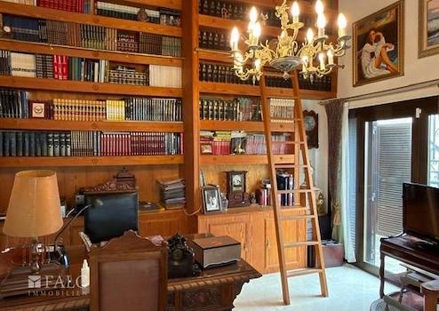Im Obergeschoss befinden sich drei Schlafzimmer, jeweils mit eigener Terrasse, zwei Badezimmer sowie ein weiterer Raum, der derzeit als Bibliothek genutzt wird, sich jedoch flexibel umgestalten lässt. Eine Garage mit Platz für zwei bis drei Fahrzeuge ergänzt das Angebot.