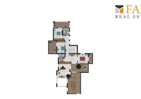 Das zweite Haus verfügt über circa 120 m² Wohnfläche und eignet sich ideal als Gästehaus oder separate Wohneinheit. Im Erdgeschoss befindet sich ein Raum, der als Schlafzimmer oder Studio genutzt werden kann, sowie ein Badezimmer. Im Obergeschoss befinden sich ein Wohnzimmer mit Zugang zu einer großen Terrasse, ein Schlafzimmer mit Bad en Suite sowie eine kleine Küche.