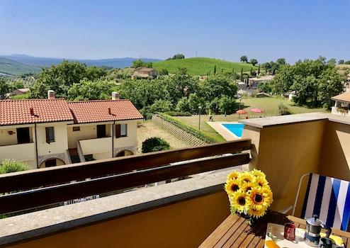 Vom Schlafzimmer, vom Wohnzimmer und auch vom Balkon aus schweift der Blick weit über die sanften Weinberge der Toskana. Morgens taucht die aufgehende Sonne die Landschaft in warmes Gold, abends genießen Sie hier die Ruhe und die besondere Stimmung eines toskanischen Sonnenuntergangs.