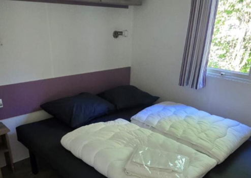Gemütliches Schlafzimmer mit Doppelbett, Blick ins Grüne und viel Privatsphäre. Neben den auf dem Foto abgebildeten Schränken gibt es auch einen Kleiderschrank und Regale für zusätzlichen Stauraum.