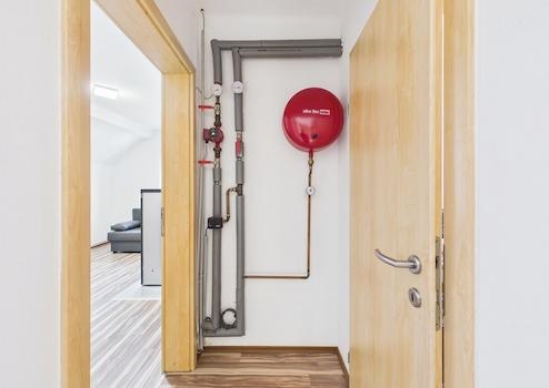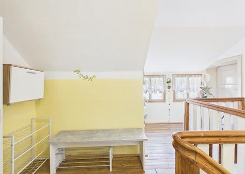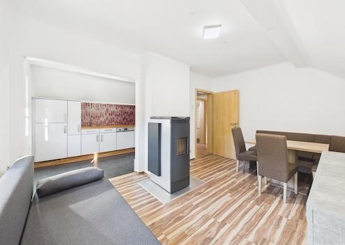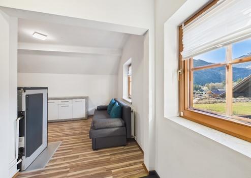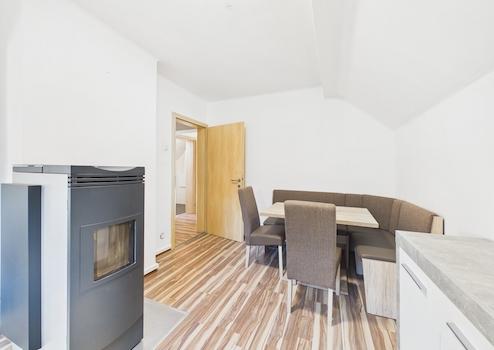 Beheizt wird die Wohnung über eine eigene Pellets-Etagenheizung mit Radiatoren – eine unabhängige und gut steuerbare Lösung. Warmwasser wird über einen Boiler aufbereitet. Die Fenster bestehen teilweise aus 2-fach verglasten Kunststoffelementen, teilweise aus Holzfenstern.
