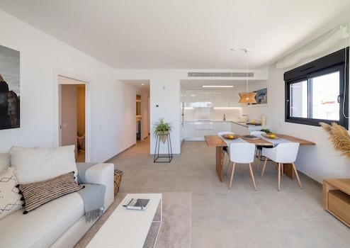 Diese stilvolle Wohnanlage vereint modernes Design, komfortable Ausstattung und eine attraktive Lage in Meeresnähe. Die großzügigen Apartments verfügen über drei Schlafzimmer und zwei Badezimmer und bieten durchdachte Grundrisse, die sowohl für Familien als auch für anspruchsvolle Eigennutzer oder Investoren ideal geeignet sind. Große Terrassen schaffen einen fließenden Übergang zwischen Innen- und Außenbereich und laden dazu ein, das mediterrane Klima in vollen Zügen zu genießen. Besonders die Terrassen mit herrlichem Meerblick bieten den perfekten Ort zum Entspannen, während ausgewählte Einheiten zusätzlich mit einem privaten Solarium überzeugen und ein Höchstmaß an Privatsphäre bieten.
