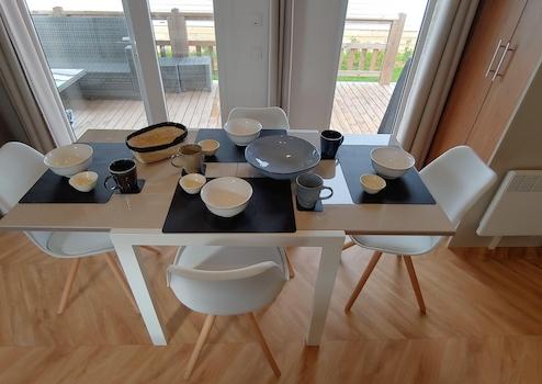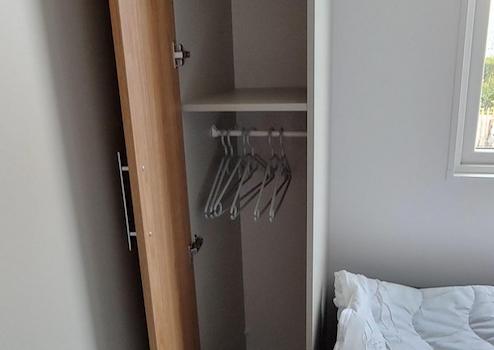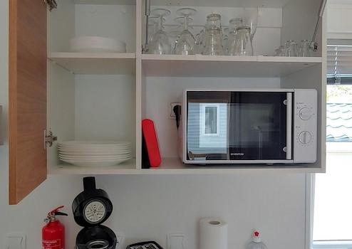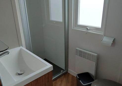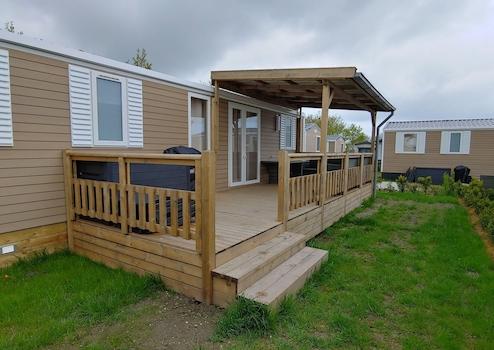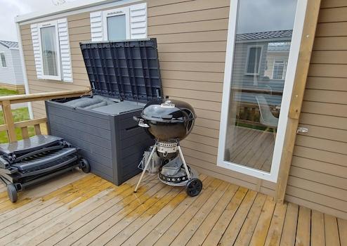Das Chalet vom Baujahr 2021 ist ein 44 qm2 großes Modell mit Wohn/Essbereich, voll ausgestatteter Einbauküche, drei Schlafzimmer mit insg. 6 Schlafplätzen, einem Badezimmer mit Dusche und Toilette, 2.separate Dusche, 2.separate Toilette und eine grosse Terrasse mit Überdachung, wetterfeste Sitzgruppe und einen Weber-Grill.
