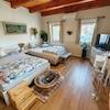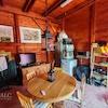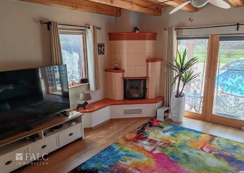 - und dahinter der Wohnzimmerbereich mit einem weiteren beeindruckendem Kachelofen