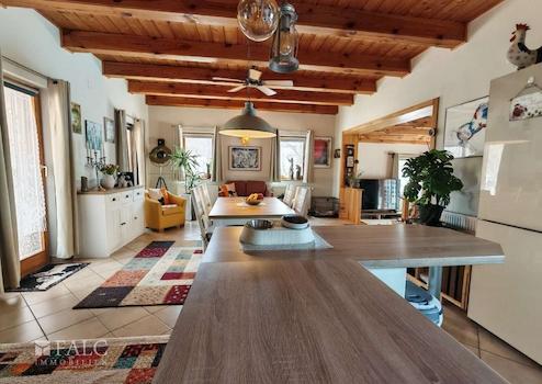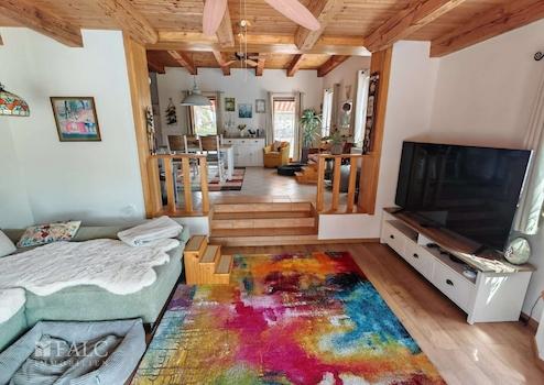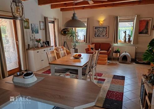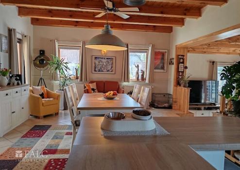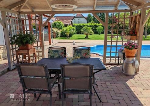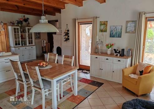 Das ebenerdige und dadurch altersgerechte Anwesen überzeugt auf ganzer Linie innen durch seine perfekt gelöste Raumaufteilung und außen unter anderem durch den ungarischen Landhausstil mit den runden Säulen auf der Veranda.