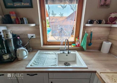 - die offene und sehr hochwertig eingerichtete Küche mit Blick in den Garten und auf den Pool