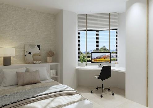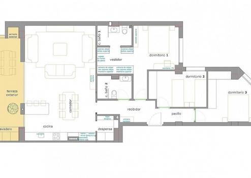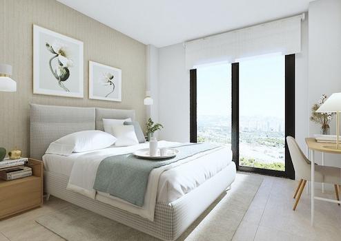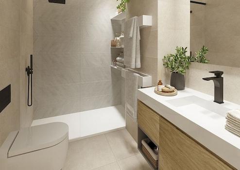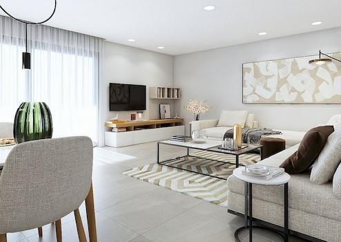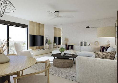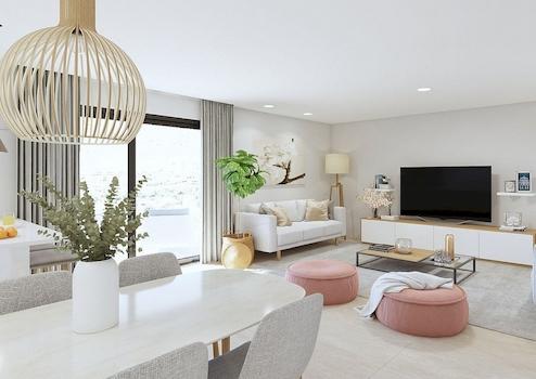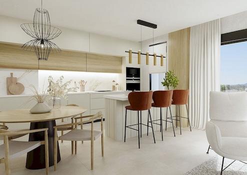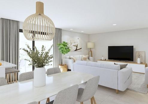 Moderne Eigenschaften mit 3 Schlafzimmern und 2 Bädern, ein geräumiges Wohnzimmer mit offener Küche und Schiebefenster, die Zugang zur Terrasse geben.