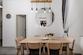 Die Küche ist komplett ausgestattet mit allen notwendigen Geräten, darunter ein Pyrolyse-Backofen, eine Mikrowelle, ein Wasserkocher, eine Kaffeemaschine, ein Toaster und ein Samsung-Kühlschrank mit 280 Litern Nutzinhalt und einem zusätzlichen Gefrierfach von 114 Litern. Angrenzend an die Küche befindet sich ein Esszimmer für gemeinsame Mahlzeiten.