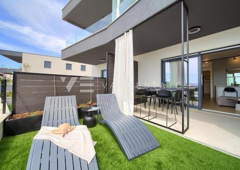 Immobilieninsel Krk, Stadt Krk – Zum Verkauf steht eine 73,20 m² große Ferienwohnung im Hochparterre eines neueren Stadthauses in bester Lage in Krk. Die Ferienwohnung besteht aus einer Eingangshalle, zwei Schlafzimmern, zwei Badezimmern, einem geräumigen Wohnzimmer mit Küche und Essbereich sowie einer großen überdachten Terrasse mit herrlichem Blick auf das Meer und die Altstadt von Krk. Hochwertige Bauweise und Ausstattung, PVC-Fenster und -Türen mit elektrischen Rollläden, eine DAIKIN Multisplit-Klimaanlage (je ein Außen- und Innengerät pro Zimmer), hochwertiges Parkett in den Zimmern und großformatige, erstklassige Keramikfliesen im restlichen Bereich, hochwertige Einbau-Badezimmerausstattung und wandhängende WCs sind nur einige der Vorzüge dieser luxuriösen Immobilie. Zur Ferienwohnung gehören außerdem zwei Parkplätze im gemeinschaftlichen Innenhof des Gebäudes. Sie wird komplett möbliert verkauft, alle erforderlichen Dokumente sind vorhanden und sie ist sofort bezugsfertig. Die Lage ist erstklassig: nur 700 m vom Stadtzentrum und 800 m von wunderschönen Stränden entfernt. Eine hervorragende Gelegenheit für Wohnzwecke oder als Kapitalanlage zur Langzeit- oder touristischen Vermietung.