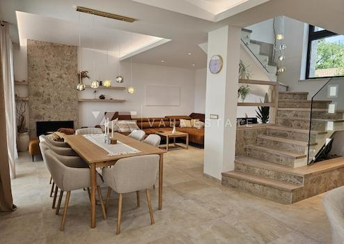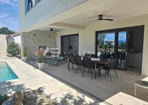 Immobilienangebot auf der Insel Krk, in der Nähe der Stadt Krk: Eine neue, moderne freistehende Villa mit teilweisem Meerblick steht zum Verkauf. Das Haus befindet sich auf einem 450 m² großen Grundstück und bietet 190 m² Wohnfläche auf zwei Etagen, die durch eine Innentreppe verbunden sind. Im Erdgeschoss befinden sich Eingangsbereich, Gäste-WC, Heizungsraum, Wohnküche und ein geräumiges Wohnzimmer mit Zugang zu einer überdachten Terrasse. Im Obergeschoss befinden sich vier geräumige Schlafzimmer, jeweils mit eigenem Bad. Für den Bau wurden hochwertige Materialien und Ausstattungen verwendet, darunter Keramikfliesen, Klimaanlage in allen Räumen, Fußbodenheizung, hochwertige PVC-Einbaufenster und -türen, Sicherheitstüren und hochwertige Sanitäreinrichtungen. Die Villa ist komplett möbliert und mit neuen, modernen Möbeln ausgestattet und wird im jetzigen Zustand verkauft. Auf dem wunderschön angelegten und umzäunten Grundstück, das Privatsphäre bietet, befinden sich eine überdachte Terrasse, ein Garten mit mediterranen Pflanzen, ein Swimmingpool mit Liegewiese und mehrere Parkplätze. Das Anwesen befindet sich in ruhiger Lage, fernab vom Lärm und der Hektik der Stadt, aber dennoch in Strandnähe und in unmittelbarer Nähe zum Stadtzentrum mit allen Annehmlichkeiten. Es bietet sich hervorragend zur Eigennutzung an, ist aber auch eine attraktive Investitionsmöglichkeit zur touristischen Vermietung. Die Immobilienagentur Vala Estate Malinska gewährleistet Ihnen eine sichere und transparente Eigentumsübertragung sowie die Bereitstellung aller erforderlichen Dokumente.