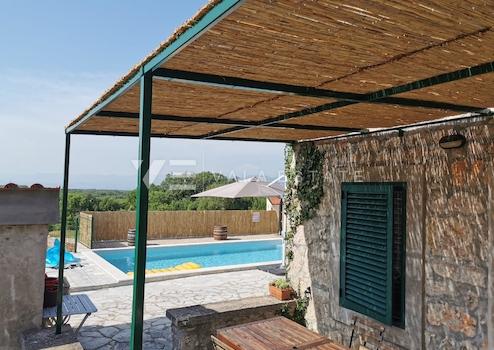 Immobilien Insel Krk, Region Malinska – Ein charmantes, freistehendes Steinhaus steht auf einem großzügigen Grundstück von 913 m² zum Verkauf. Das Haus wurde im typisch mediterranen Stil renoviert und verfügt über eine Gesamtwohnfläche von 100 m², verteilt auf zwei Etagen. Im Erdgeschoss befinden sich eine Küche mit Esszimmer und Zugang zu zwei Terrassen, ein Wohnzimmer und ein alter Wassertank, der auf Wunsch zu einem zusätzlichen Raum umgebaut werden kann. Eine Innentreppe führt in den ersten Stock, der aus zwei Schlafzimmern, einem Badezimmer und einer Terrasse besteht. Im wunderschön angelegten Garten von 744 m² befinden sich ein Gartenhaus, mehrere Parkplätze und eine Sonnenterrasse mit einem 35 m² großen Pool. Das Haus ist voll möbliert und kann sofort bezogen oder touristisch vermietet werden. Diese Immobilie befindet sich in ruhiger Lage, etwa 3 km vom Meer und den ersten Stränden entfernt und ist eine ideale Gelegenheit für alle, die einen ruhigen Urlaub genießen möchten.