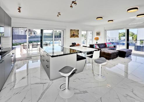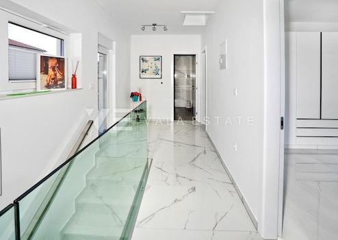 Immobilien Insel Krk, Malinska – in einer äußerst schönen und ruhigen Lage nahe dem Zentrum von Malinska steht ein modernes Einfamilienhaus mit eleganten Linien mit hervorragender Aufteilung, einem Swimmingpool und einem herrlichen Blick auf das Meer zum Verkauf. Das Haus hat eine Gesamtfläche von 164,50 m2 und verteilt sich auf das Erdgeschoss, wo sich ein Flur, ein Badezimmer, ein Abstellraum mit Toilette und ein Bereich befinden, der Küche, Esszimmer und Wohnzimmer mit Zugang zu einer überdachten Terrasse vereint , während sich im ersten Stock zwei weitere Schlafzimmer, ein Kleiderschrank, zwei Badezimmer und zwei geräumige Terrassen mit offenem Meerblick befinden. Das Haus ist mit außergewöhnlich hochwertigen Materialien, hochwertiger Keramik und modernen Sanitärartikeln, einer Kombination aus PVC- und ALU-Zimmerei mit Dreifachverglasung, Daikin/Mitsubishi-Klimaanlagen, Fußbodenheizung mit Wärmepumpe im ganzen Haus und Videoüberwachung ausgestattet. Es ist komplett mit hochwertigen modernen Möbeln und Geräten ausgestattet und wird als solches verkauft. Der 650 m2 große Hof ist dezent dekoriert und gepflastert, mit viel Grün und mediterranen Pflanzen veredelt und wird durch einen beheizten Pool mit Meerwasser, einen 24 m2 großen Pool, ein Sonnendeck, eine Sommerküche und einen Parkplatz mit Fernöffnung vervollständigt . Die Lage ist sehr angenehm und ruhig und nur 1000 m vom Zentrum von Malinska, schönen Stränden und allen Annehmlichkeiten entfernt. Die Mehrwertsteuer ist im Preis inbegriffen.