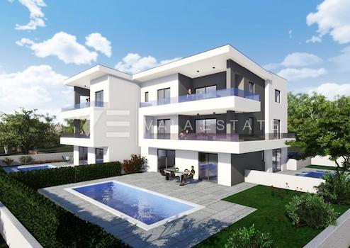 Immobilieninsel Krk, Malinska – zum Verkauf steht eine Ferienwohnung mit einer Gesamtwohnfläche von 78,51 m2 im zweiten Stock eines neuen Mehrfamilienhauses. Es besteht aus einer Eingangshalle, zwei Schlafzimmern, einem Badezimmer, einer Toilette, einer Küche mit Esszimmer und einem Wohnzimmer mit Zugang zu einer großen überdachten Terrasse mit freiem Blick auf das Meer. Zur Ferienwohnung gehört eine zusätzliche Einzimmer Ferienwohnung mit einer Wohnfläche von 36,89 m2 im Erdgeschoss des Gebäudes, die aus einer Eingangshalle, einem Schlafzimmer, einem Badezimmer und einem Raum besteht, der Küche, Esszimmer und Wohnzimmer vereint Zimmer mit Zugang zum Garten von 35 m2. Es verfügt außerdem über zwei Parkplätze im Gemeinschaftshof. Hochwertige Bauweise und Ausstattung, erstklassige Bodenbeläge und ein klimatisiertes Heiz-/Kühlsystem, elektrische Fußbodenheizung, PVC-Tischlerei mit Moskitonetzen und elektrischen Jalousien sind nur einige Merkmale dieses modernen Neubaus. Es befindet sich in einer großartigen Lage in der Nähe wunderschöner Strände und aller Annehmlichkeiten. Die Immobilie befindet sich derzeit im Bau, Fertigstellung und Bezug sind für Sommer 2024 geplant. Die Mehrwertsteuer ist im Preis enthalten und der Käufer zahlt keine Immobilienumsatzsteuer.