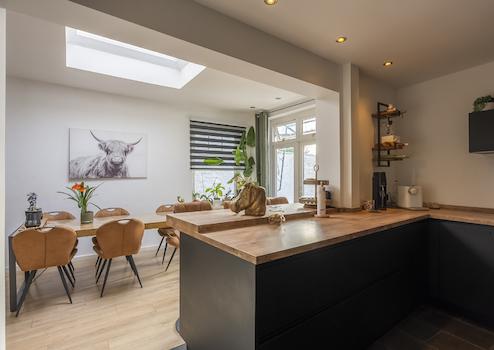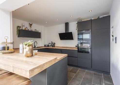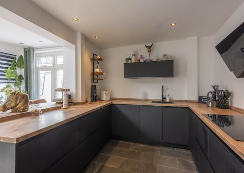 Induktionskochfeld, Dunstabzugshaube, Geschirrspüler, Backofen, Kombi-Mikrowelle und Kühlschrank.