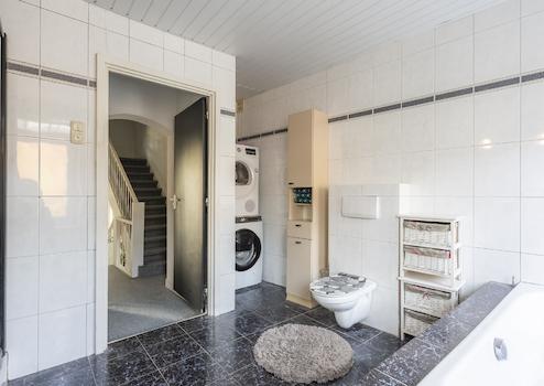 Das geräumige Badezimmer ist ca. 11 m² groß und mit einer Badewanne, einer Dusche, einem WC, einem Doppelwaschbecken und den Anschlüssen für Waschmaschine und Trockner ausgestattet.