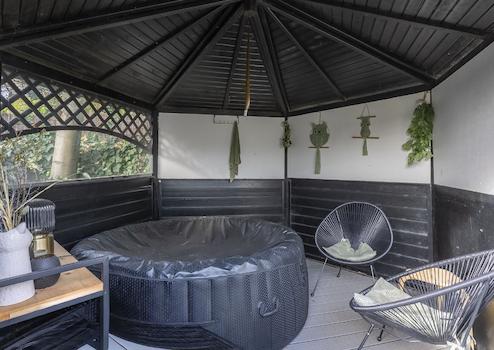 Der gemütliche Garten verfügt über eine große Rasenfläche, ein Schuppen (der derzeit als Heimfitnessstudio genutzt wird) und eine gemütliche Überdachung mit Whirlpool.