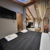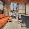 Der Schlafbereich befindet sich im zentralen Teil der Wohnung und ist dezent durch Vorhänge abgetrennt, wodurch ein intimer und ruhiger Rückzugsort entsteht. Holzelemente im Design sowie sanfte Ambientebeleuchtung verstärken die gemütliche Atmosphäre des Raumes. Der Wohnbereich ist modern und elegant eingerichtet und geht nahtlos in die Küche über, die kompakt, aber vollständig funktional und für den täglichen Gebrauch ausgestattet ist.