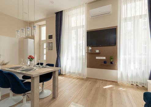 A lakás teljes felújításon esett át, beleértve az elektromos és vízvezeték-hálózat cseréjét is. Műanyag nyílászárók, biztonságos műanyag bejárati ajtó, valamint három klímaberendezés is beszerelésre került. A konyha teljesen gépesített: beépített mosogatógép, hűtő, sütő, főzőlap és páraelszívó is rendelkezésre áll. A világítás Smart Home rendszerrel vezérelhető. Három televízió található a lakásban, a szolgáltatói előkészítés diszkréten, a mennyezetbe rejtett dobozban lett kialakítva.