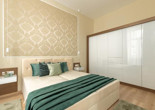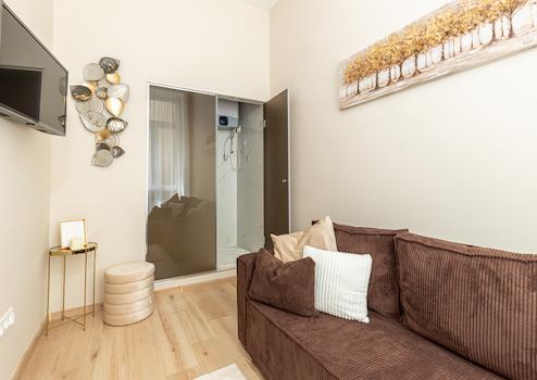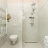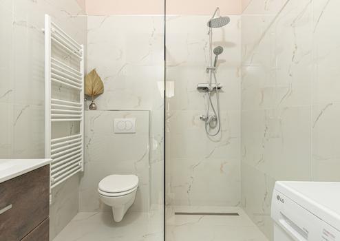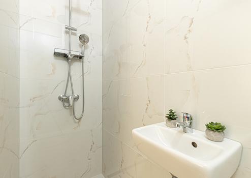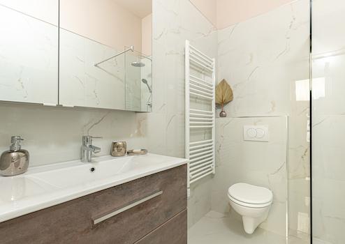 Die Aufteilung der Wohnung ist praktisch: Es gibt ein Wohnzimmer, zwei Schlafzimmer und zwei separate Badezimmer. Das eine Badezimmer ist mit einer Dusche und einer Toilette ausgestattet, das andere mit einer Dusche und einer Waschmaschine. In die Decke eingebaute Lüftungsöffnungen sorgen für eine ausreichende Belüftung. Die Heizung erfolgt über einen Konvektor-Kessel vom Typ Mika mit dreiteiligen Heizkörpern, die Warmwasserversorgung erfolgt über einen Elektroboiler.