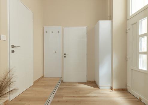 A lakás elosztása praktikus: nappali, két hálószoba, valamint két külön fürdőszoba került kialakításra. Az egyik fürdő zuhanyzóval és WC-vel, a másik zuhanyzóval és mosógéppel felszerelt. A mennyezetbe épített szellőzők biztosítják a megfelelő szellőzést. A fűtésről Mika típusú konvektor kazán gondoskodik, háromlapos radiátoros hőleadással, a meleg vizet villanybojler szolgáltatja.