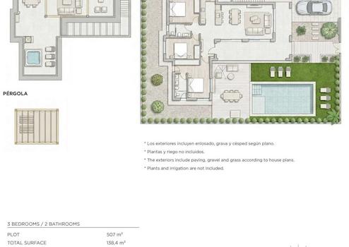 Das Anwesen verfügt über drei Schlafzimmer und zwei Badezimmer mit einer praktischen und funktionalen Raumaufteilung. Der offene Wohnbereich vereint Wohnzimmer, Esszimmer und Küche zu einem hellen und einladenden Raum mit großen Fenstern, die direkten Zugang zum Garten und Pool bieten und so ein komfortables und harmonisches Wohngefühl schaffen.