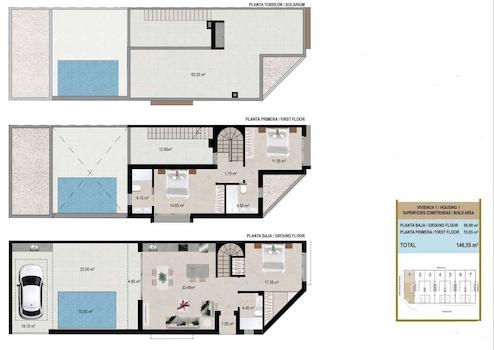 Jedes Haus verfügt über 3 Schlafzimmer, 3 Badezimmer und einen Stellplatz auf dem Grundstück. Die Häuser sind modern gestaltet und bieten ein offenes Wohnkonzept mit Einbauküche und Wohn-/Essbereich.