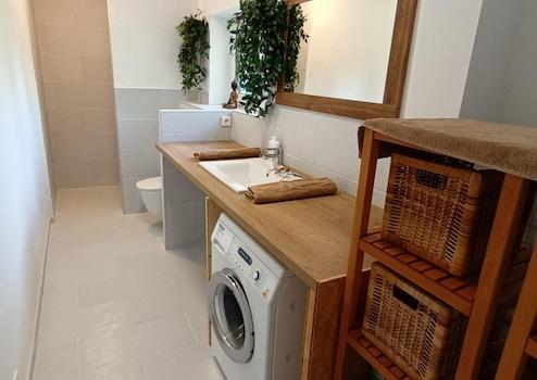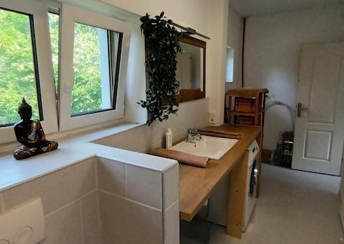 Badezimmer 9,5 m² mit Dusche, Hänge-WC, Waschmaschine (Miele)