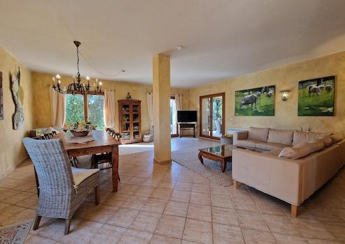 Dieses Haus empfängt Sie voll ausgestattet und bereit zum Einziehen. Genießen Sie höchsten Komfort durch eine Zentralheizung und eine moderne Split-/Klimaanlage in allen Räumen. Der großzügige Wohnbereich besticht durch ein Eck-Ledersofa, einen Esstisch für 8 Personen, eine offene Küche im mallorquinischen Stil mit Gasherd. In den Schlafzimmern finden Sie maßgeschneiderte Einbau-Kleiderschränke. Auch der Außenbereich überzeugt: moderne Korb-Terrassenmöbel, ein massiver Holzesstisch und exklusive Sonnenliegen laden zum Entspannen ein. Ein besonderes Highlight ist der Pool mit Gegenstromanlage, während eine Regenwasserzisterne die nachhaltige Bewässerung des Gartens sichert. Für eine Erweiterung der Wohnfläche kann das Obergeschoss mit 71 Quadratmetern Innen noch voll ausgebaut werden. Genießen Sie volle Gestaltungsfreiheit! (Kabelkanäle etc. sind bereits gelegt).