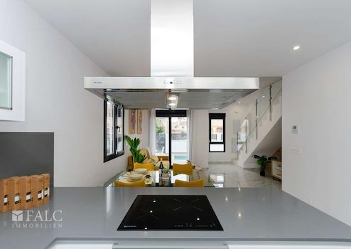 Das Haus überzeugt mit einer offenen Raumgestaltung und viel natürlichem Licht. Im Erdgeschoss befindet sich ein großzügiger Wohn- und Essbereich mit moderner offener Küche, ein Schlafzimmer sowie ein Badezimmer. Vom Wohnbereich gelangt man direkt auf die Terrasse und in den privaten Garten mit eigenem Pool – perfekt für entspannte Tage im Freien.