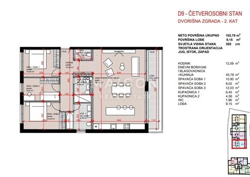 Zum Verkauf steht eine Wohnung in begehrter Lage, in der Nähe aller Einrichtungen des täglichen Bedarfs. Die Wohnung befindet sich im zweiten Stock des Gebäudes und hat eine Nettonutzfläche von 102,79 m², während die tatsächliche Fläche 111,94 m² beträgt. Die Wohnung ist nach Süden, Osten und Westen ausgerichtet.