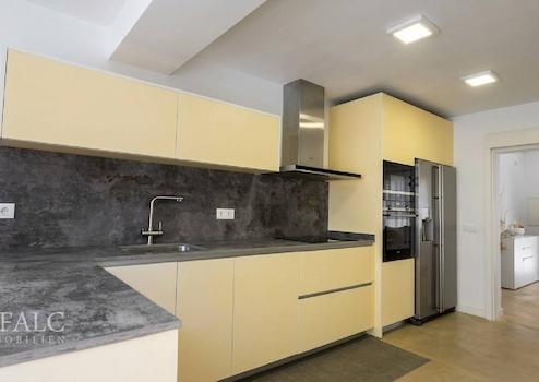 Der großzügige Wohn- und Essbereich ist lichtdurchflutet und öffnet sich direkt zur Terrasse mit Pool und zum Garten. Dadurch entsteht ein fließender Übergang zwischen Innen- und Außenbereich, der ein besonders angenehmes Wohngefühl vermittelt. Die moderne Küche überzeugt durch ihre klare Gestaltung und funktionale Aufteilung.