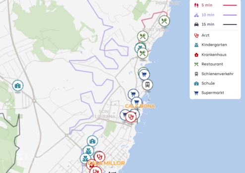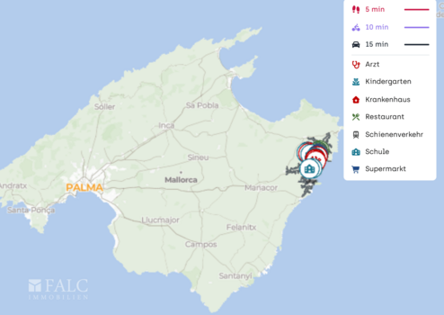 Trotz der ruhigen Wohnlage sind alle wichtigen Einrichtungen des täglichen Lebens schnell erreichbar. Die Orte Son Servera, Cala Millor und Costa de los Pinos bieten eine sehr gute Infrastruktur mit Supermärkten, Ärzten, Schulen und vielfältigen Freizeitmöglichkeiten.