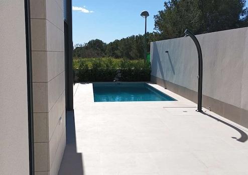 Treten Sie hinaus in Ihren privaten Garten mit Poolbereich, wo Sie die Sonne genießen, sich erfrischen oder Ihre Gäste stilvoll empfangen können. Die Terrasse ist ideal für Mahlzeiten im Freien, zum Entspannen oder einfach, um den ruhigen Blick auf den Golfplatz zu genießen.