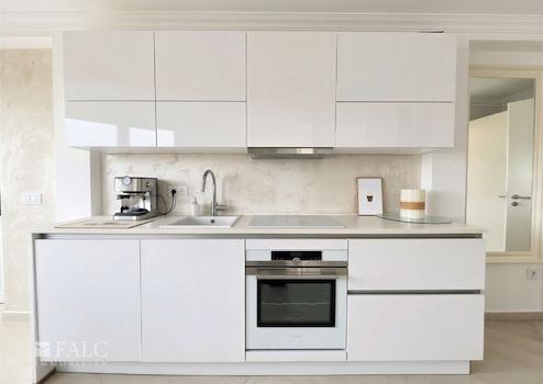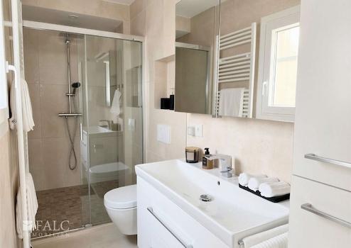 Die Wohnung verfügt über ein komfortables Schlafzimmer mit Meerweitblick, das bereits beim Aufwachen ein besonderes Wohngefühl vermittelt. Das moderne Badezimmer ist hochwertig ausgestattet und verfügt über eine elegante Dusche.