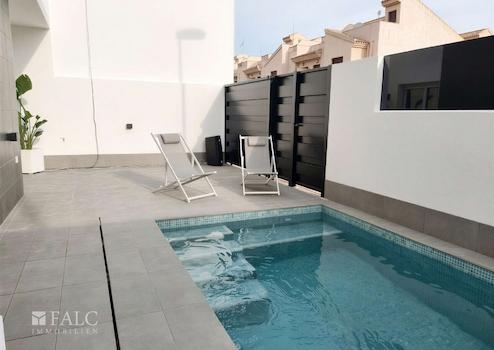 Das durchdachte Konzept maximiert das mediterrane Licht: Während der private Garten mit Pool zum Verweilen einlädt, bietet das riesige Solarium im Obergeschoss den ganzen Tag über Sonne pur. Die Architektur besticht durch eine elegante Fassade aus weißem Mörtel und grauen Keramik-Akzenten, ergänzt durch moderne Glaselemente, die für ein offenes und luxuriöses Wohngefühl sorgen.