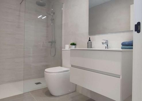 Details: Hochwertige PVC-Fenster mit Sonnenschutz-Doppelverglasung, elektrische Rollläden und moderne Sanitärobjekte von Marken wie Roca.