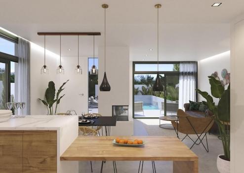 Die Villa wurde mit viel Liebe zum Detail und hochwertigsten Materialien gebaut, um eine moderne und gleichzeitig gemütliche Atmosphäre zu schaffen. Große Fenster im Wohn- und Essbereich fluten die Räume mit natürlichem Licht und bieten gleichzeitig einen herrlichen Blick auf die umliegende Landschaft. Durch die offene Architektur wird das Zusammenspiel von Innen- und Außenbereich perfekt betont. Die integrierten Kleiderschränke in den Schlafzimmern sorgen für praktischen Stauraum und tragen zur Ordnung und Eleganz bei.