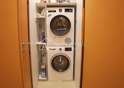 Der Flur ist symmetrisch gestaltet und endet mit einem großen Spiegel von Boden bis zur Decke, der den Raum optisch vergrößert. Hinter dem Spiegel befindet sich ein versteckter Waschraum mit Waschmaschine, Trockner und Stauraum.